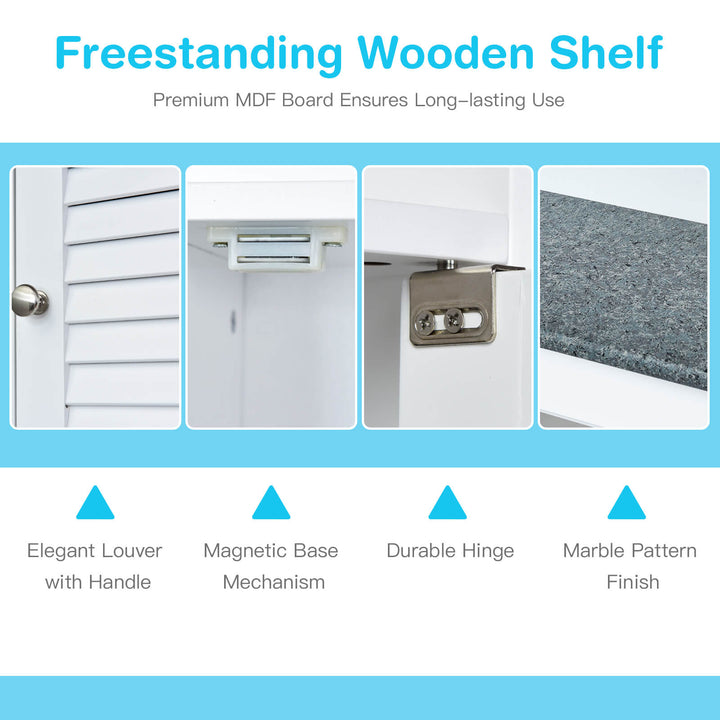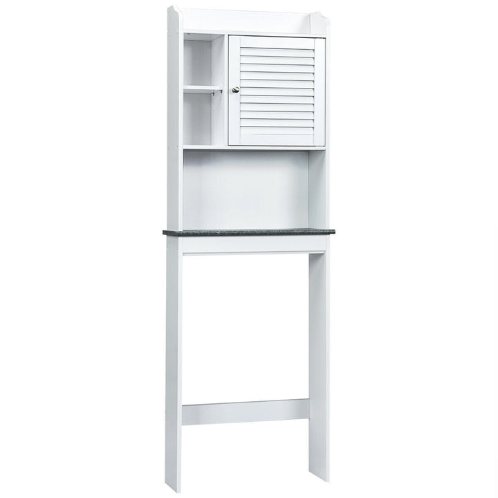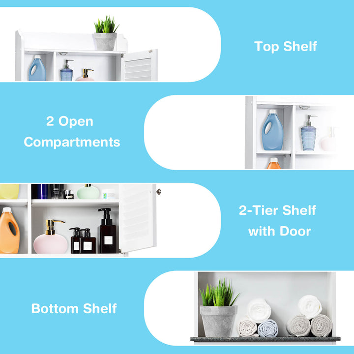 Ample Storage Space: Featuring an enclosed shelf with a louvered door, open cubbies, and shelves, this unit offers versatile storage options for bathroom accessories, laundry essentials, and decorative items, helping to keep your space organized and tidy.