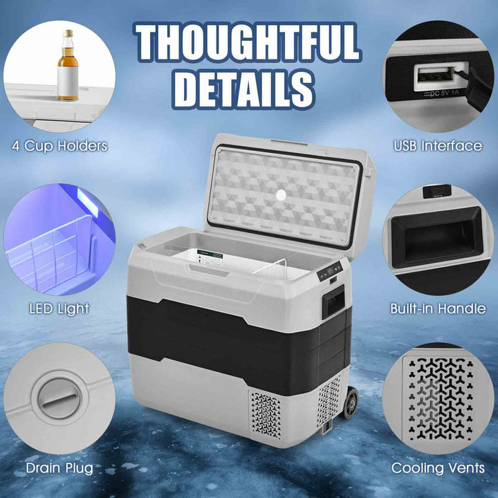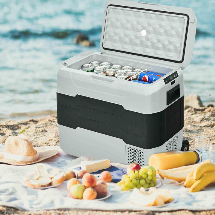 Embark on your next adventure with our expansive 42-Qt Dual Zone Car Fridge, expertly engineered to cater to your mobile refrigeration needs. This innovative fridge offers a generous 42-quart capacity, ingeniously divided into two zones by a removable partition, allowing for simultaneous refrigeration and freezing of a diverse array of items¡ªfrom beverages and meats to skincare products and medications.