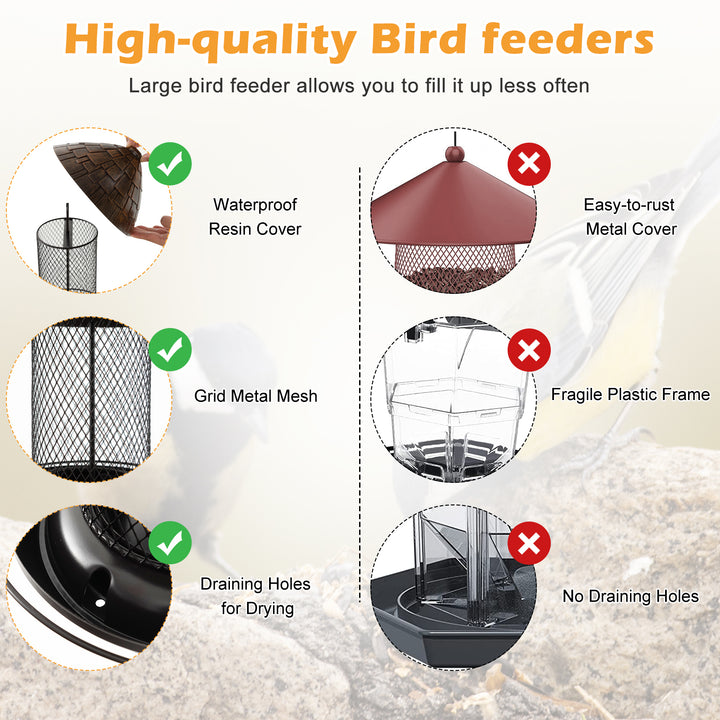 All-Weather Protection: A wide, weather-resistant resin roof provides shelter for the feed, safeguarding it against rain and maintaining the feeders integrity against cracks and weather-induced wear, ensuring it remains a reliable source of nourishment for birds in all seasons.
