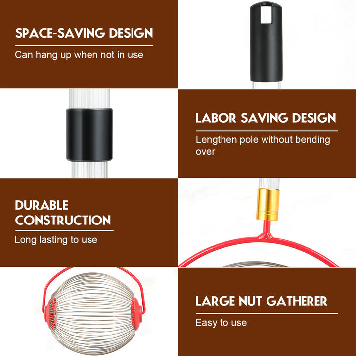 Robust and Durable Design: Constructed with carbon steel and featuring a welded construction, this nut gatherer is built to last. It boasts a comfortable handle grip, a storage hook, and a heat-tempered wire cage that retains its shape use after use.