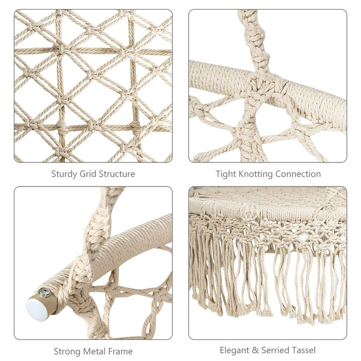 Bohemian Elegance: Inspired by bohemian style, this hammock swing chair features a chic interlacing pattern and elegant draping tassels, offering a perfect blend of retro charm and modern sophistication. Its pure white color seamlessly integrates into both retro and contemporary settings.