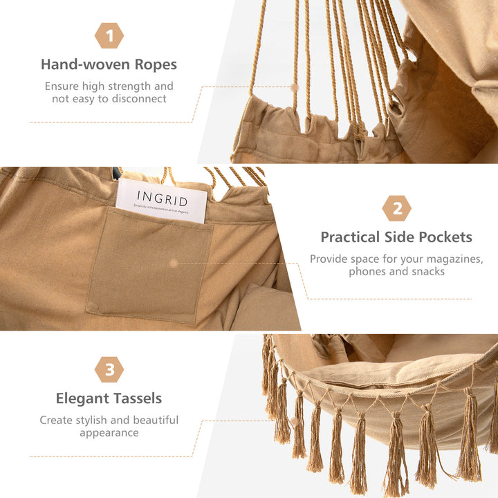 Comfortable Seating Experience: Made from premium cotton canvas and hand-woven cotton ropes, the hammock chair is both skin-friendly and enduring. The generously sized seat invites you to sink in and enjoy expansive relaxation, while the handy side pocket keeps your reading materials or glasses within easy reach.