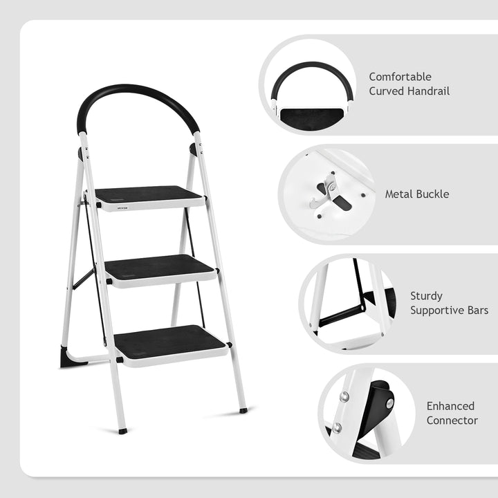 Enhanced Safety Features: The top anti-slip handgrip offers additional safety and ease of use, ensuring a firm hold as you climb or carry the ladder. Each step features a 9.5" x 5.3" anti-slip pedal, providing secure footing and stability, reducing the risk of slips and falls.
