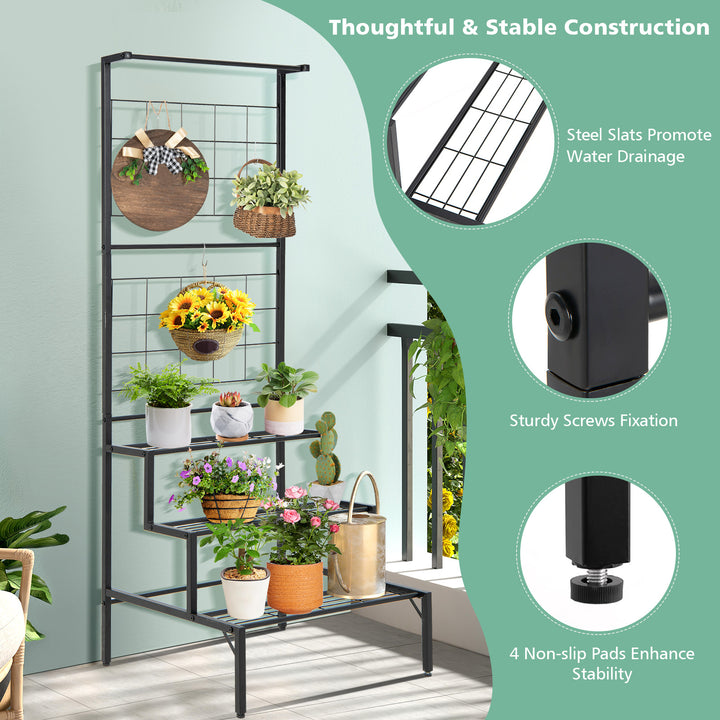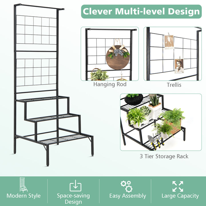 Expansive Display Options: With three tiers of shelving, dual trellises, and a top hanging rod, this plant stand provides a generous platform for displaying your plants and decorative items, elevating the aesthetics of any room.