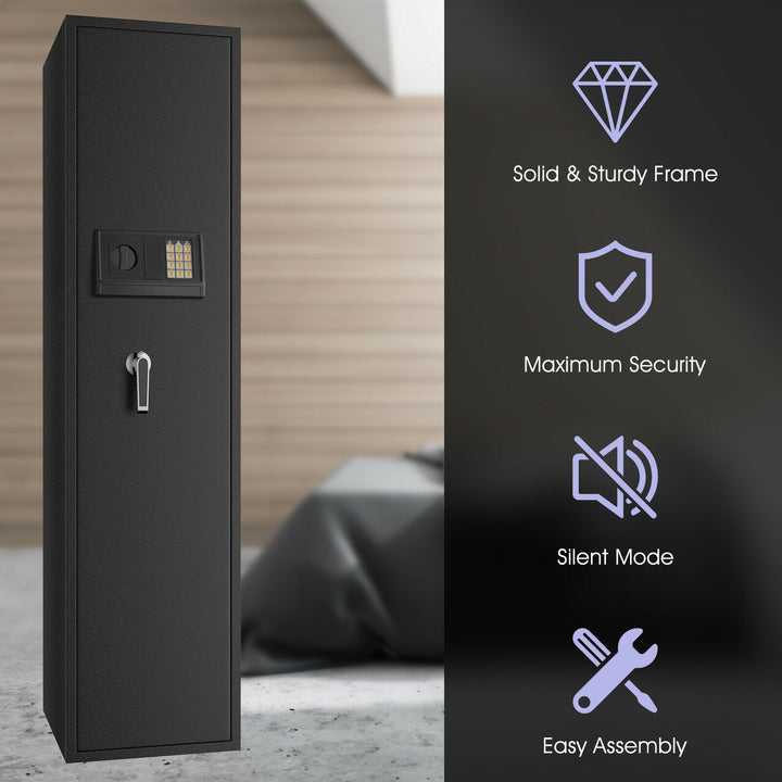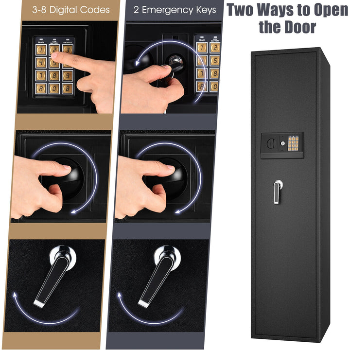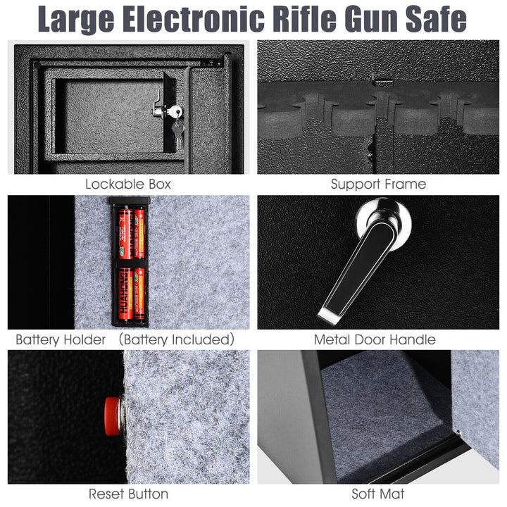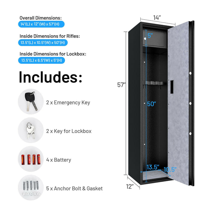 Spacious and Protective Storage: With dimensions deep enough to accommodate up to 5 rifles up to 50" in length, this safe ensures your firearms are stored securely. Soft mats lining the bottom and the back of the door offer additional protection, preventing scratches and damage to your rifles. The separate lockbox at the top is ideal for safely storing bullets, handguns, jewelry, and other small valuables.