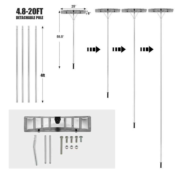 Adjustable Length for Easy Reach: The snow rake offers an impressive adjustable range from 4.8 ft to 20 ft, thanks to its 4 extendable poles. This feature ensures you can effortlessly clear snow from high and hard-to-reach places without the risk associated with climbing.